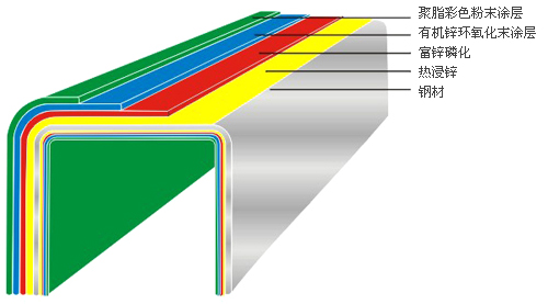 熱浸鋅:起到電化學(xué)保護作用,由內(nèi)到外防止鋼鐵基材的生銹。